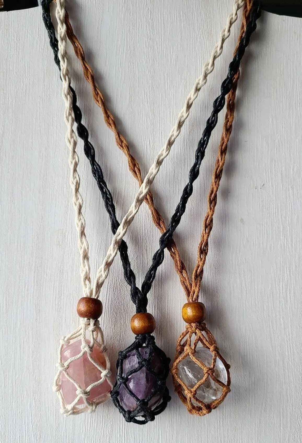 Material: White, brown and White macrame cord pouch necklace, Rose quartz, amethyst and Clear quartz tumbled stones, Wood beads.