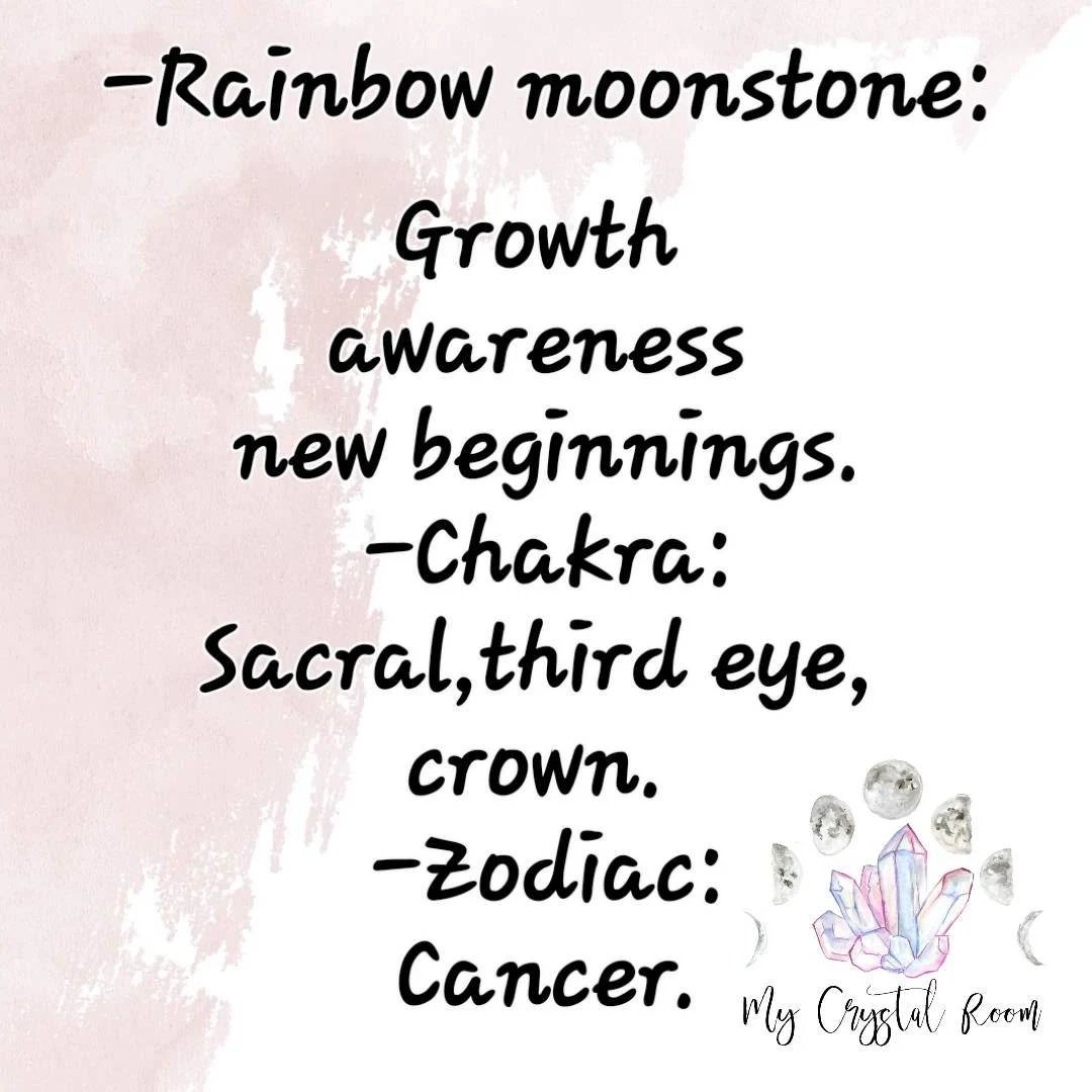 Rainbow moonstone is thought to bring balance, harmony and hope while enhancing creativity, compassion, endurance and inner confidence. Rainbow moonstone is believed to help strengthen intuition and psychic perception, especially offering us visions of things that aren't immediately obvious.