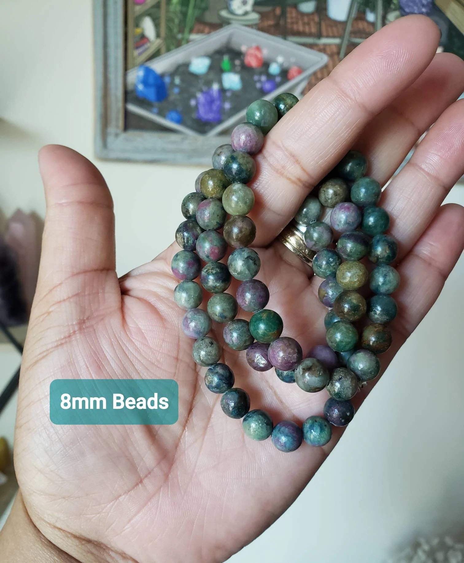 Ruby kyanite crystal bracelet, Gemstone bracelet, Ruby in Kyanite is an excellent crystal attunement stone that initiates the movement of Kundalini energies. Ruby is a stone that encourages one to “follow their bliss.” Ruby is an excellent stone increasing life force energy or “chi” in life, as it overcomes exhaustion and lethargy, and calms hyperactivity.